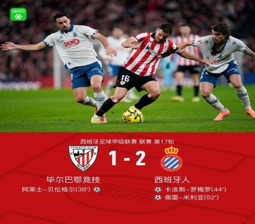 北京時間12月23日,西班牙足球甲級聯(lián)賽第17輪展開角逐,畢爾巴鄂競技主場迎戰(zhàn)西班牙人。上半場,阿萊士-貝倫格爾破門率先取得進(jìn)球。隨后,卡洛斯-羅梅羅扳平比分。下半場,多蘭送出助攻,佩蘭-米利亞破門將比分反超。最終,西班牙人客場2-1逆轉(zhuǎn)畢爾巴鄂競技。